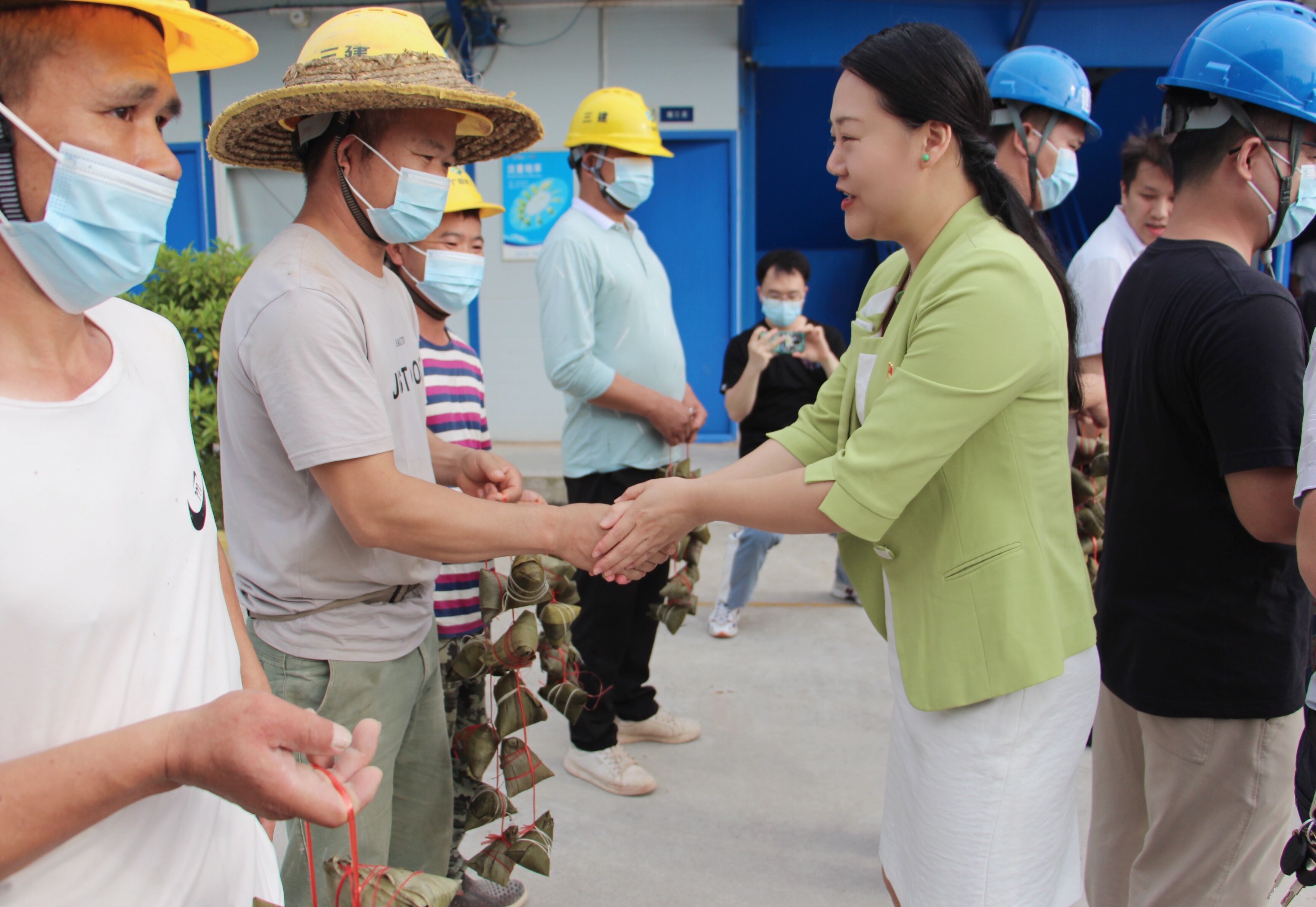 關(guān)心關(guān)懷進(jìn)工地,濃濃粽情暖人心。座談會(huì)后,此次聯(lián)建的各黨支部相關(guān)領(lǐng)導(dǎo)共同慰問(wèn)了項(xiàng)目一線工人,為他們送去粽子等慰問(wèn)品和最真摯的節(jié)日問(wèn)候,感謝一線工人的辛勤勞動(dòng)、敬業(yè)付出以及為綠港?金陽(yáng)產(chǎn)業(yè)城等南寧市重點(diǎn)項(xiàng)目建設(shè)做出的貢獻(xiàn)。慰問(wèn)中,綠港集團(tuán)黨委委員、副總經(jīng)理黃麗琴關(guān)切地詢問(wèn)現(xiàn)場(chǎng)工人勞動(dòng)安全保障情況和防疫情況,叮囑大家要注意勞動(dòng)安全,防疫安全,堅(jiān)持安全與生產(chǎn)兩手抓兩不誤,希望大家繼續(xù)保持昂揚(yáng)的斗志,以高度的責(zé)任感和飽滿的工作熱情投身到項(xiàng)目建設(shè)中,為經(jīng)開(kāi)區(qū)社會(huì)經(jīng)濟(jì)高質(zhì)量發(fā)展作出貢獻(xiàn)。